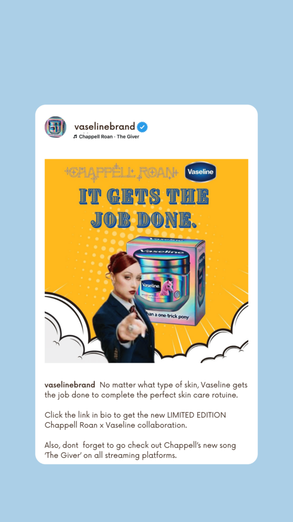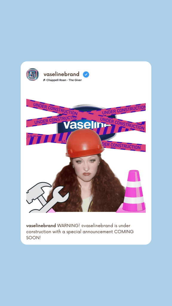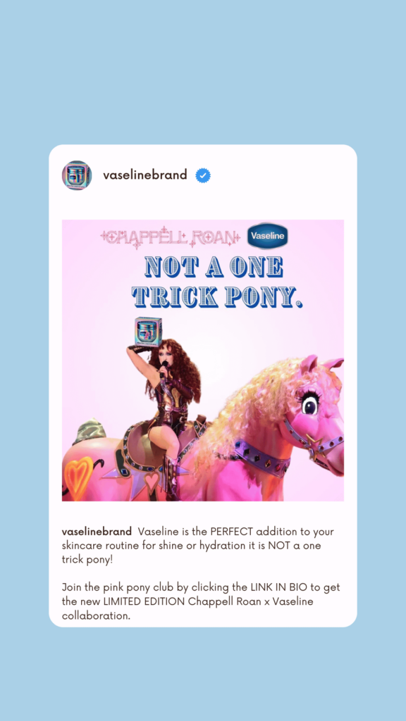 The first post would be a sneak peak of the collaboration as the site would seem ‘under construction’. The second post is showing how Chappell uses Vaseline in her skin care routine after her iconic looks and long shows. Thirdly, we introduce all the elements of the campaign. We show the pink pony which is the mascot of sorts, Chappell, our voice of the project, and the new look for our product and socials. Finally, the next three posts are iconic lyrics or symbols from Chappell’s songs which promote our campaign as well as her new album or concert looks.