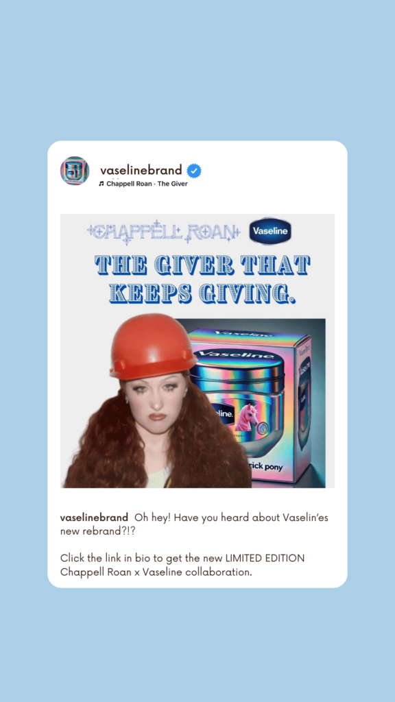 By partnering with Chappell Roan, a bold and unapologetic artist who embraces maximalism in her makeup, Vaseline is stepping into a new era that highlights Vaseline’s versatility, proving it’s not just for healing dry patches but also for removing makeup and creating standout looks. With new packaging and advertisements that highlight Chappell and her music, Vaseline is breaking the mold and redefining its place in beauty culture.