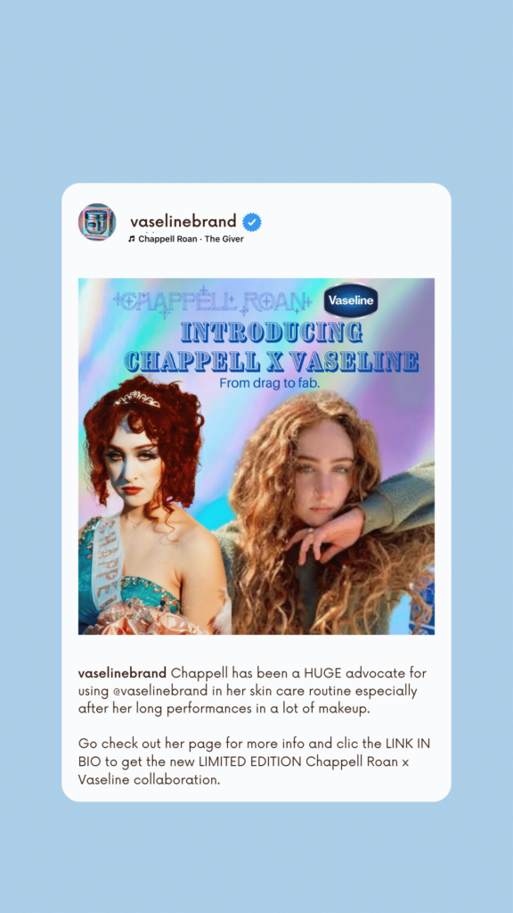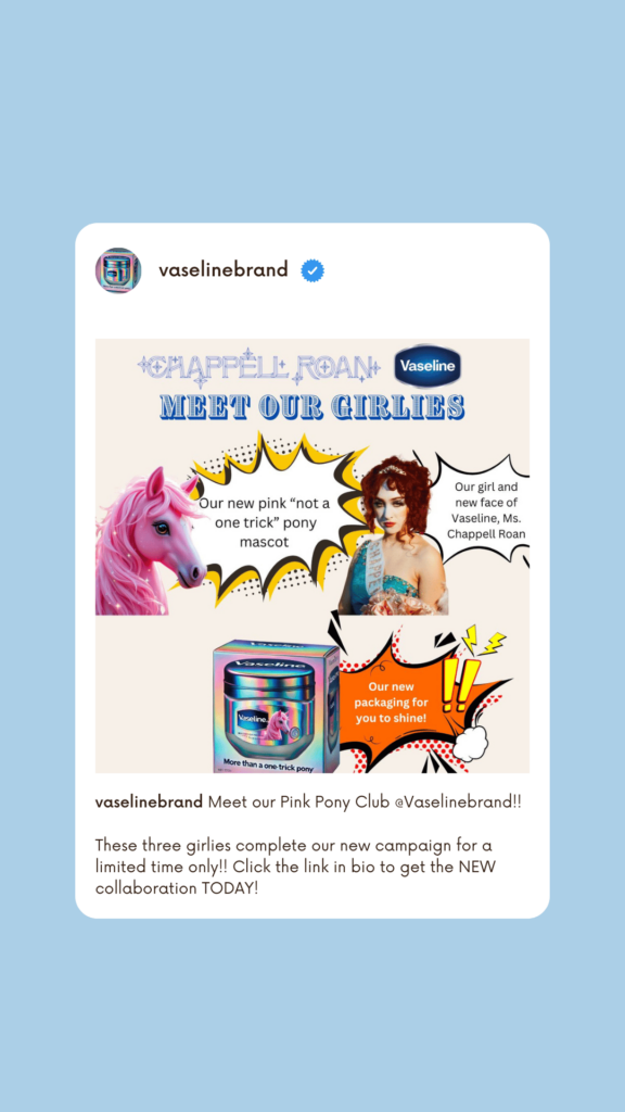 Staying true to Vaseline’s mission vision and values, the spotlight should shine on everyone. Now available in iridescent recyclable aluminum packaging, Vaseline is still committed to sustainability without compromising on quality. We are introducing new packaging and advertisements for the limited-Edition “Not a One-Trick Pony” Collection. It is essential for everyone to feel as though they can use this, and this is why Chappell Roan was so perfect. For drag queens, beauty gurus, and everyone in between, Vaseline can be the go to for skin care before, during, and after the makeup routine.