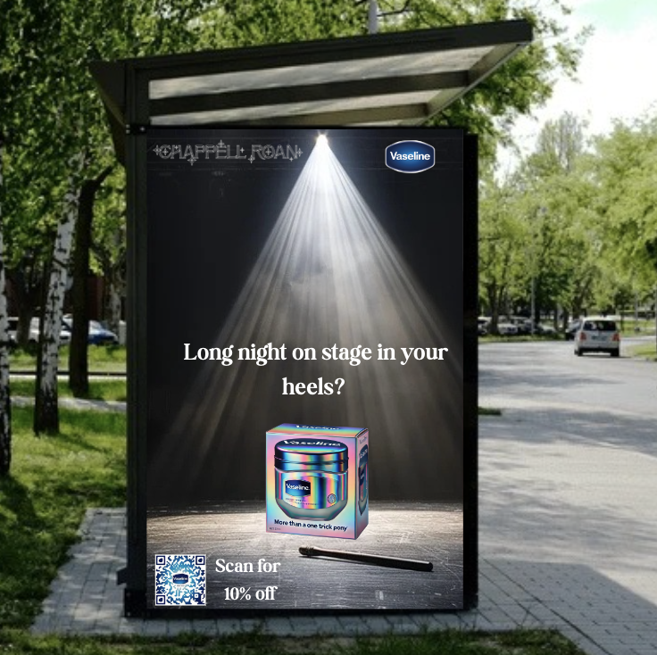 For these Out of Home Ads, Vaseline wanted to highlight this artist and incorporate a play on words based off of Chappell’s iconic moments. Her viral video saying “I’m your favorite artist’s favorite artist” took the world by storm which every member of Gen Z has seen on various social media platform. For the Billboard, petroleum jelly is something so different that added into the quote catches the attention of whoever is reading it, making them aware of the collaboration coming soon.
