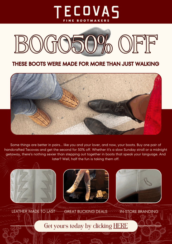 When you buy a pair of boots, you’ll get a second pair for 50% off for you and your other half. Why? Because we know these boots are made for more than just walking and two pairs are always better than one.